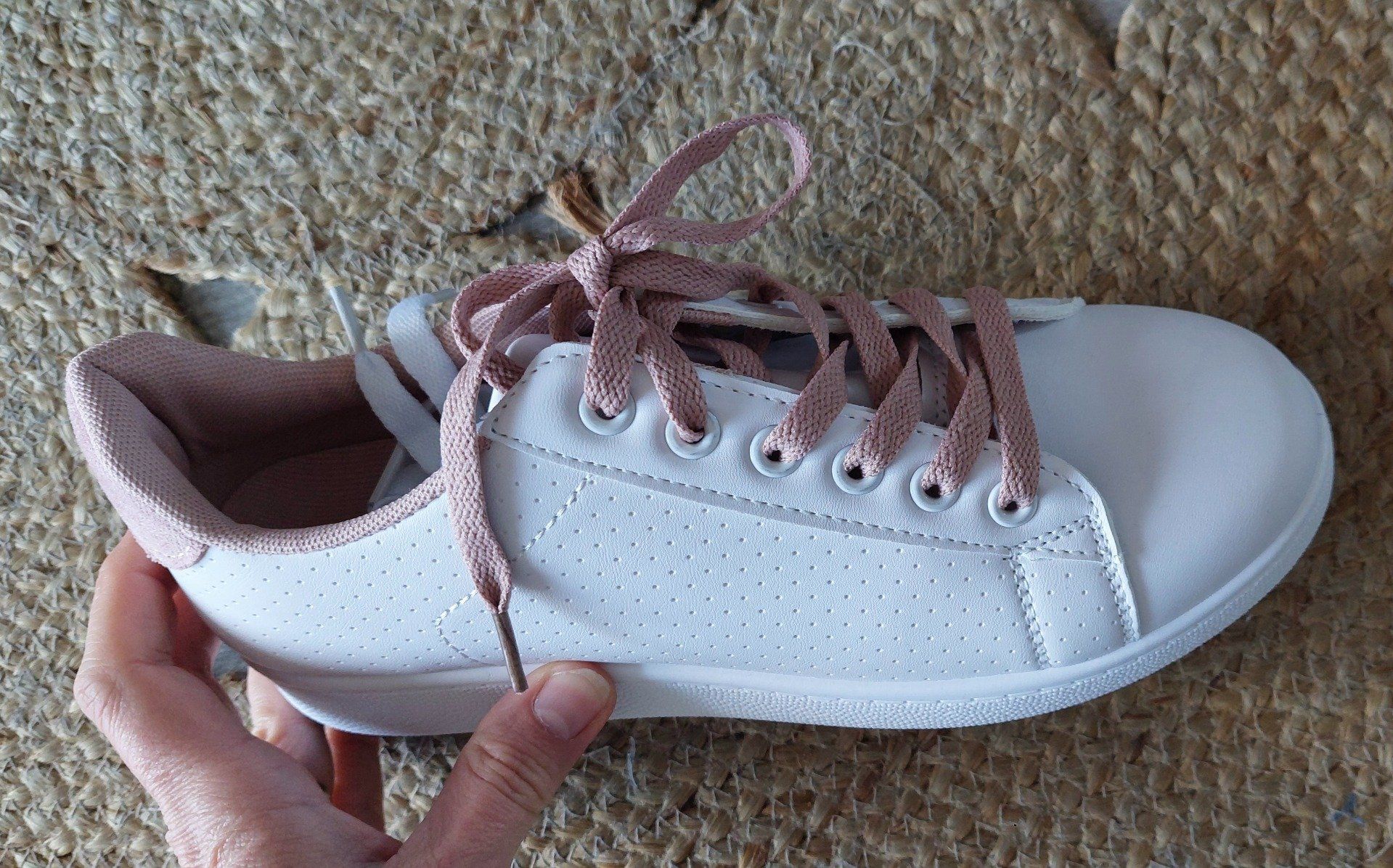 Coloris blanche, lacets blanc ou rose poudré , les 2 sont fournis .