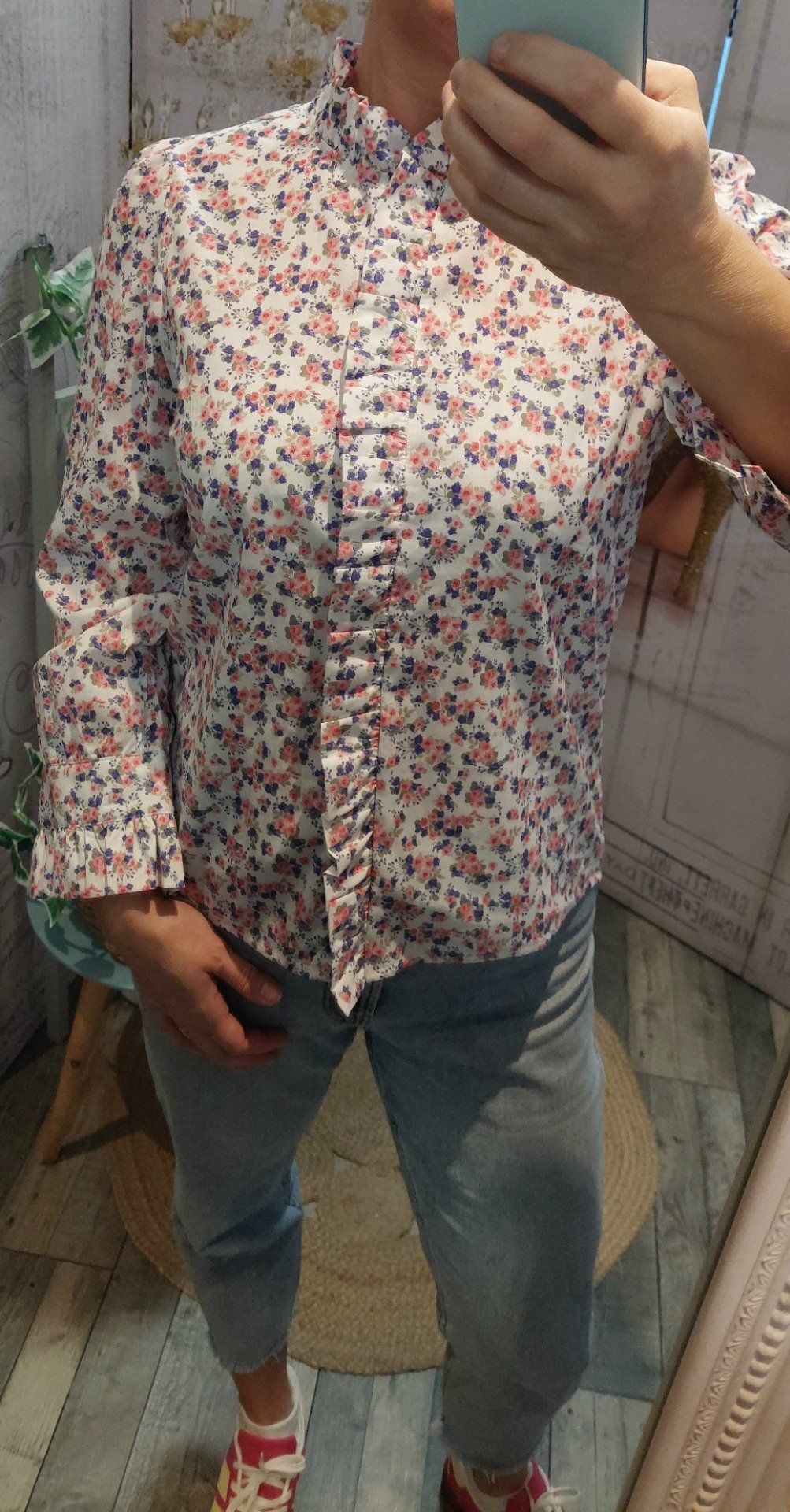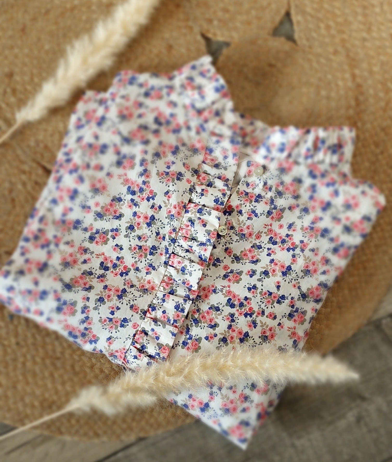 Fleurie rose et bleu avec volants sur le long des boutons