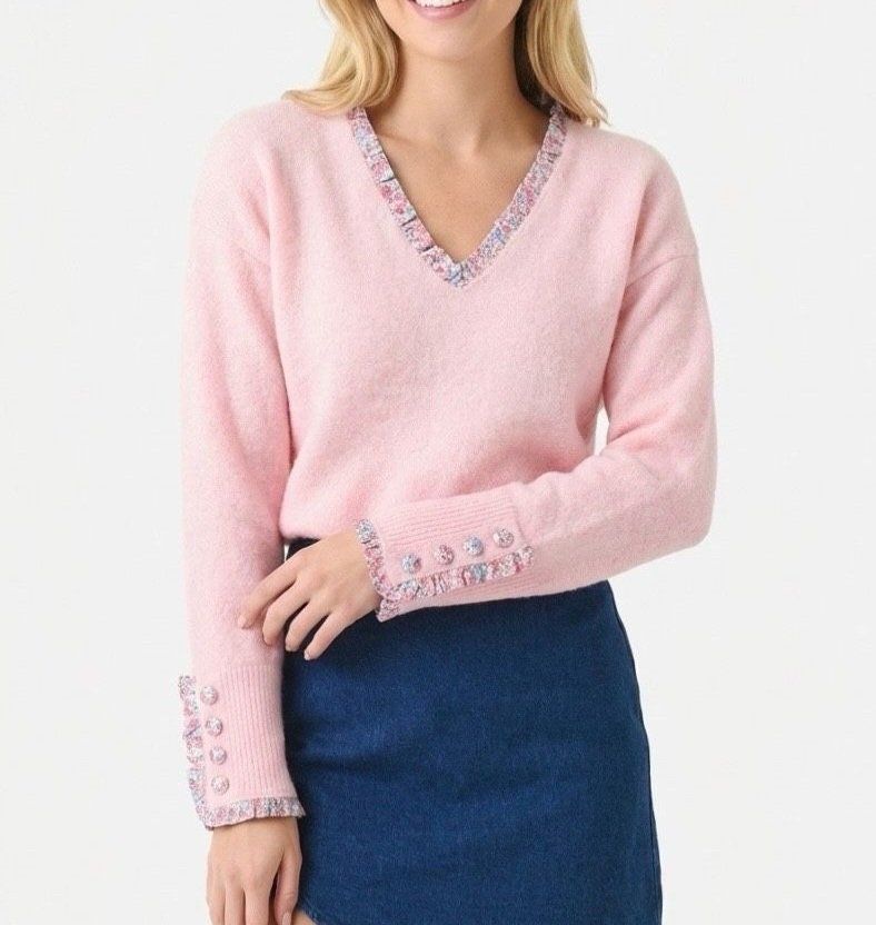 Pull rose poudré col V , contour fleuri Taille jusqu'à 44
