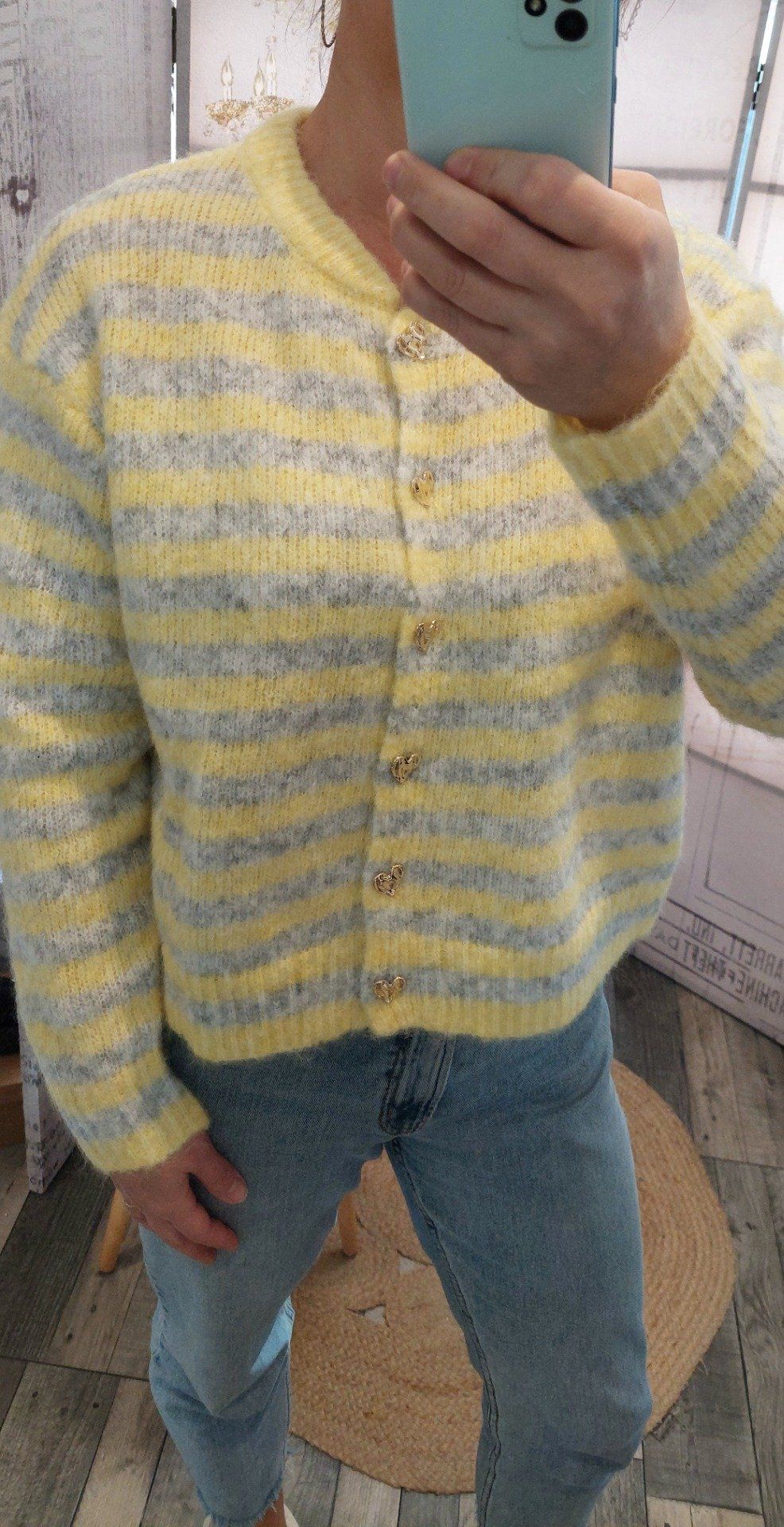 Pull tout doux , coloris jaune et gris , boutons dorés